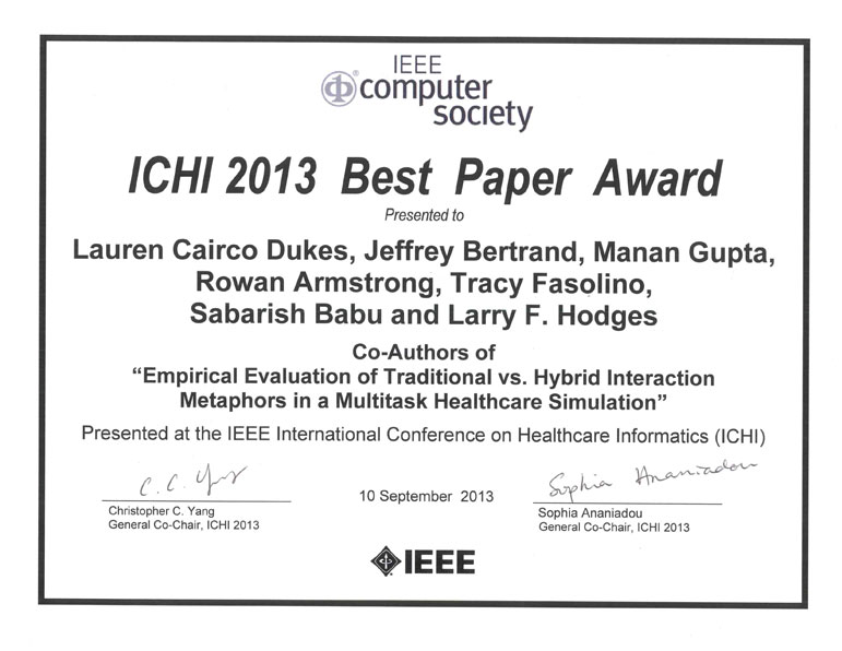 - Dukes, L.C., Bertrand, J., Gupta, M., Armstrong, R., Fasolino, T., Babu, S. and Hodges, L.F., 2013, September. Empirical Evaluation of Traditional vs. Hybrid Interaction Metaphors in a Multitask Healthcare Simulation. In 2013 IEEE International Conference on Healthcare Informatics (pp. 89-98). IEEE.