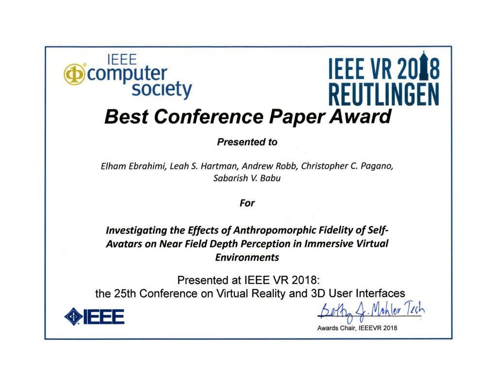 Best Conference Paper Award: IEEE International Conference on Virtual Reality and 3D User Interfaces (IEEE VR) 2018