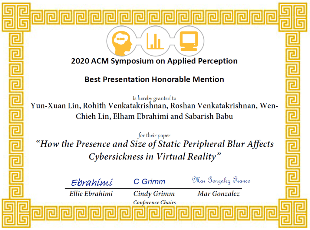 Honorable Mention for Best Presentation: ACM Symposium on Applied Perception 2020