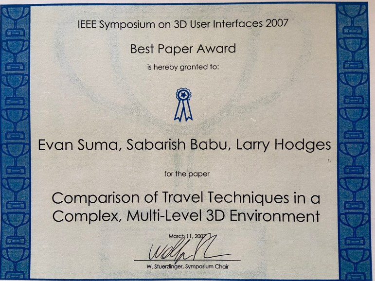 Best Paper Award: IEEE Symposium on 3D User Interfaces (IEEE 3DUI) 2007