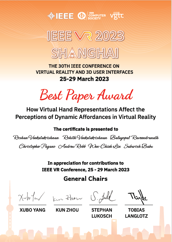 - Venkatakrishnan, R., Venkatakrishnan, R., Raveendranath, B., Pagano, C.C., Robb, A.C., Lin, W.C. and Babu, S.V., 2023. “How Virtual Hand Representations Affect the Perceptions of Dynamic Affordances in Virtual Reality,” in IEEE Transactions on Visualization and Computer Graphics, 29(5), pp. 2258-2268.