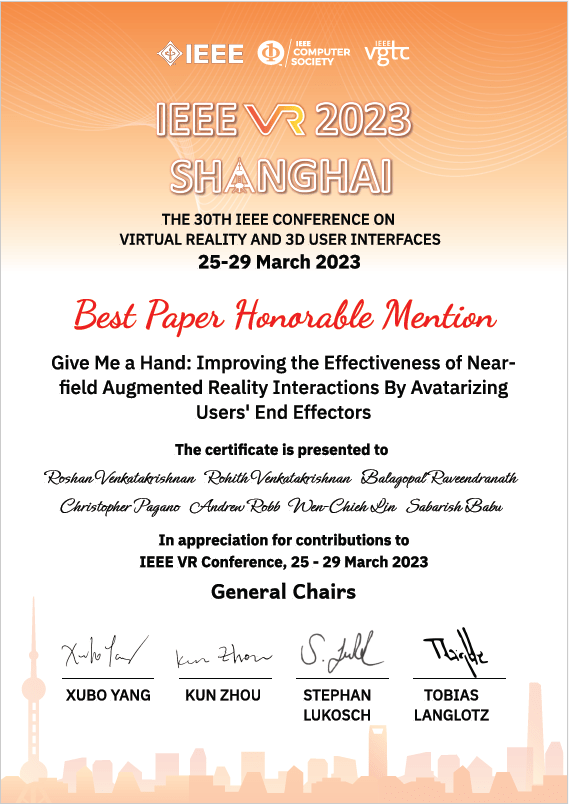 - Venkatakrishnan, R., Venkatakrishnan, R., Raveendranath, B., Pagano, C.C., Robb, A.C., Lin, W.C. and Babu, S.V., 2023. “Give Me a Hand: Improving the Effectiveness of Near-field Augmented Reality Interactions By Avatarizing Users’ End Effectors,” in IEEE Transactions on Visualization and Computer Graphics, 29(5), pp. 2412-2422.