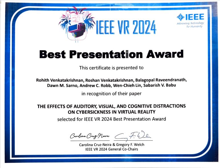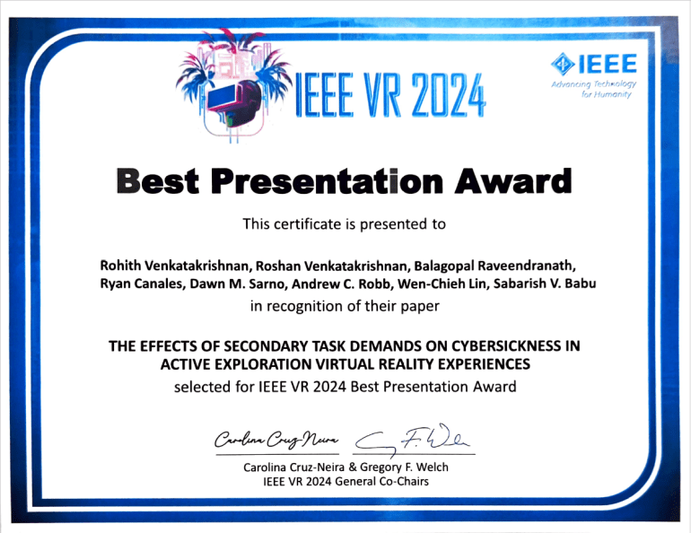 - Venkatakrishnan, R., Venkatakrishnan, R., Canales, R., Raveendranath, B., Sarno, D.M., Robb, A.C., Lin, W.C. and Babu, S.V., 2024. “The Effects of Secondary Task Demands on Cybersickness in Active Exploration Virtual Reality Experiences.” IEEE Transactions on Visualization and Computer Graphics.
