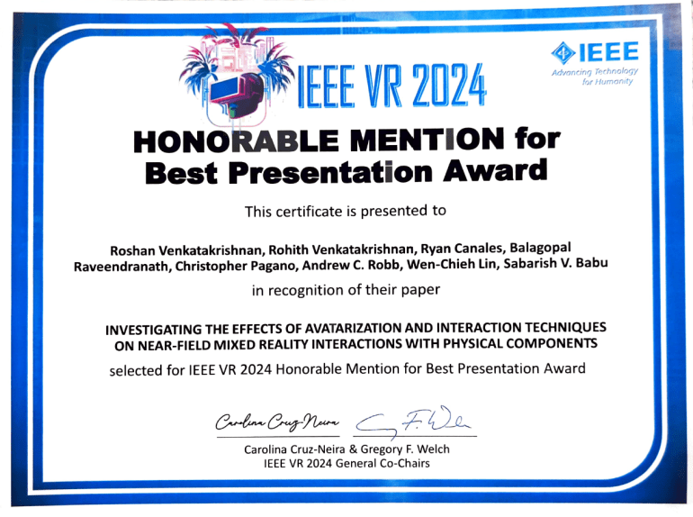 Honorable Mention for Best Presentation Award: IEEE International Conference on Virtual Reality and 3D User Interfaces (IEEE VR) 2024